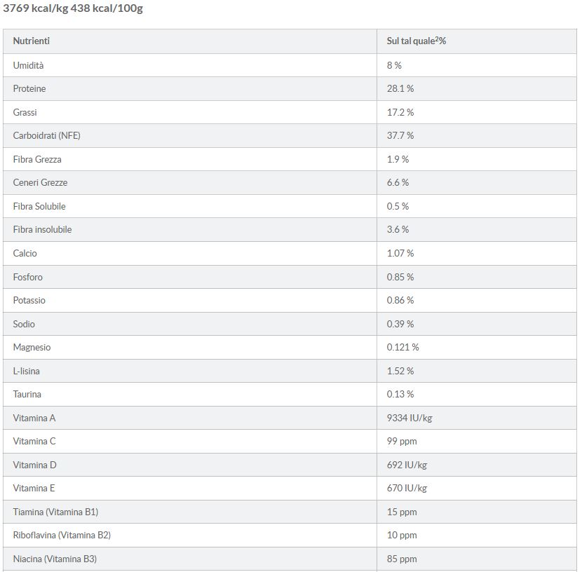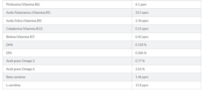 COMPONENTI ANALITICI: Proteine 28,1%, Tenore in materia grassa 17,2%, Fibra grezza 1,9%, Ceneri grezze 6,6%, Calcio 1,1%, Fosforo 0,85%, Sodio 0,39%, Potassio 0,86%, Magnesio 0,12%; per kg: Vitamina A 9.334 UI, Vitamina D3 692 UI, Vitamina E 670 mg, Vitamina C 99 mg, Beta-carotene 1,5 mg, Vitamina B1 15,3 mg, Vitamina B12 0,15 mg.