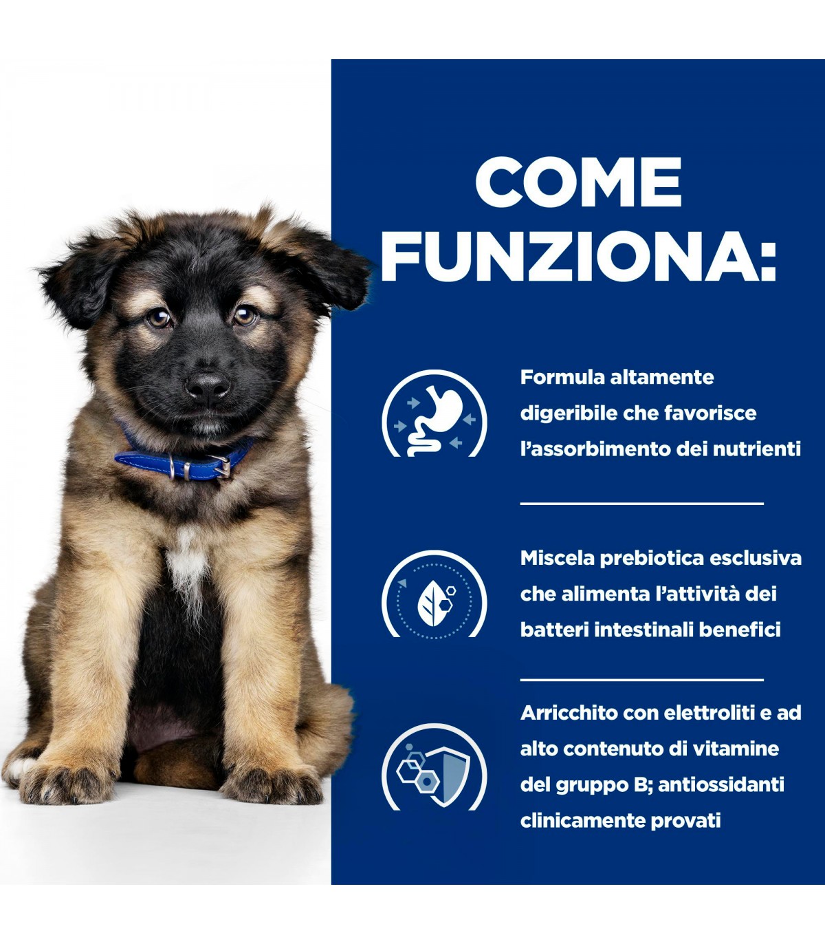 Hill’s Prescription Diet i/d alimento secco per cuccioli con pollo è un alimento dal gusto eccezionale, formulato per aiutare a ridurre i disturbi digestivi. Questo alimento altamente digeribile, con aggiunta di elettroliti e un elevato contenuto di vitamine del gruppo B, garantisce un facile assorbimento dei nutrienti e reintegra le sostanze nutritive perse. Formulato con ActivBiome+ Digestion, una speciale miscela di fibre prebiotiche proprietaria di Hill’s, che ha dimostrato clinicamente di nutrire rapidamente il microbioma intestinale per favorire una qualità ottimale delle feci e la salute dell’apparato digerente. Contiene omega-3, omega-6 e antiossidanti clinicamente testati, per favorire la salute del sistema immunitario. Hill’s Prescription Diet i/d alimento secco per cuccioli è formulato appositamente per aiutare a ridurre i disturbi digestivi e per soddisfare le speciali esigenze nutrizionali dei cuccioli.