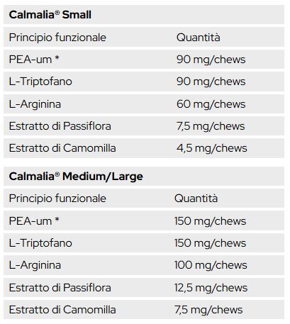CALMALIA®: COMPOSIZIONE Amido (patate), sottoprodotti di origine vegetale, glicerolo, oli e grassi, palmitoiletanolamide (6%), minerali, lieviti, zuccheri. ADDITIVI Additivi nutrizionali: L-triptofano (60000 mg/kg); L-arginina (40000 mg/kg).