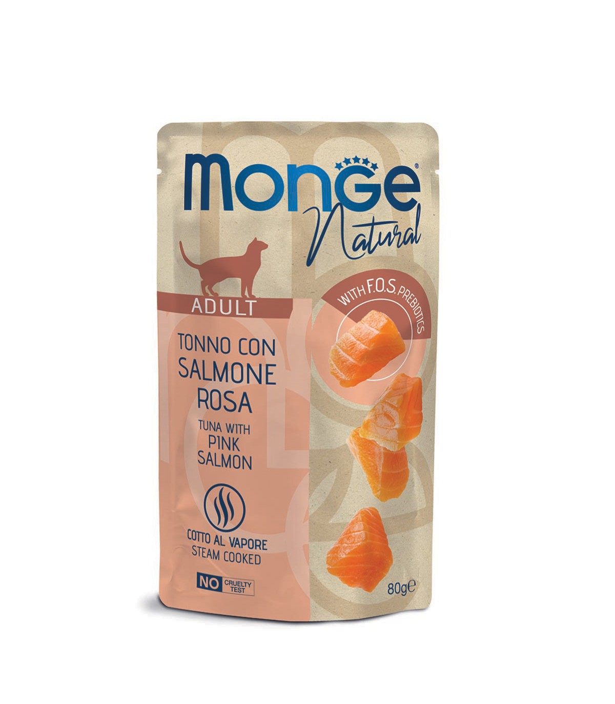 Alimento complementare per gatti adulti con deliziosi pezzetti di tonno con salmone, cotto al vapore, prodotto in Thailandia, con le tipiche caratteristiche del prodotto di alta qualità a base pesce: alta appetibilità grazie all'uso di ingredienti freschi e buon contenuto nutritivo. E’ ricco di Omega 3 e di proteine e ha un basso contenuto di grassi. Aiuta il gatto a mantenersi in buona forma e con un buon livello di energia.