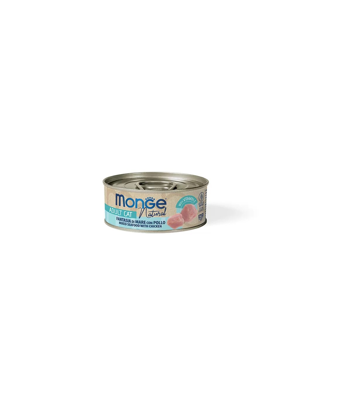 MONGE NATURAL FANTASIA DI MARE CON POLLO è un alimento complementare per gatti adulti, cotto a vapore, preparato con materie prime selezionate per le loro qualità nutrizionali. Ricetta misto mare con pollo arricchita con Frutto-oligosaccaridi (F.O.S.) per il benessere intestinale. Un gusto ricercato, adatto ai palati più raffinati. Favorisce l’attività quotidiana del gatto adulto con un buon livello di energia. Prodotto in Thailandia senza coloranti e conservanti aggiunti. No Cruelty test, Dolphin Save e Sea Water Fish.