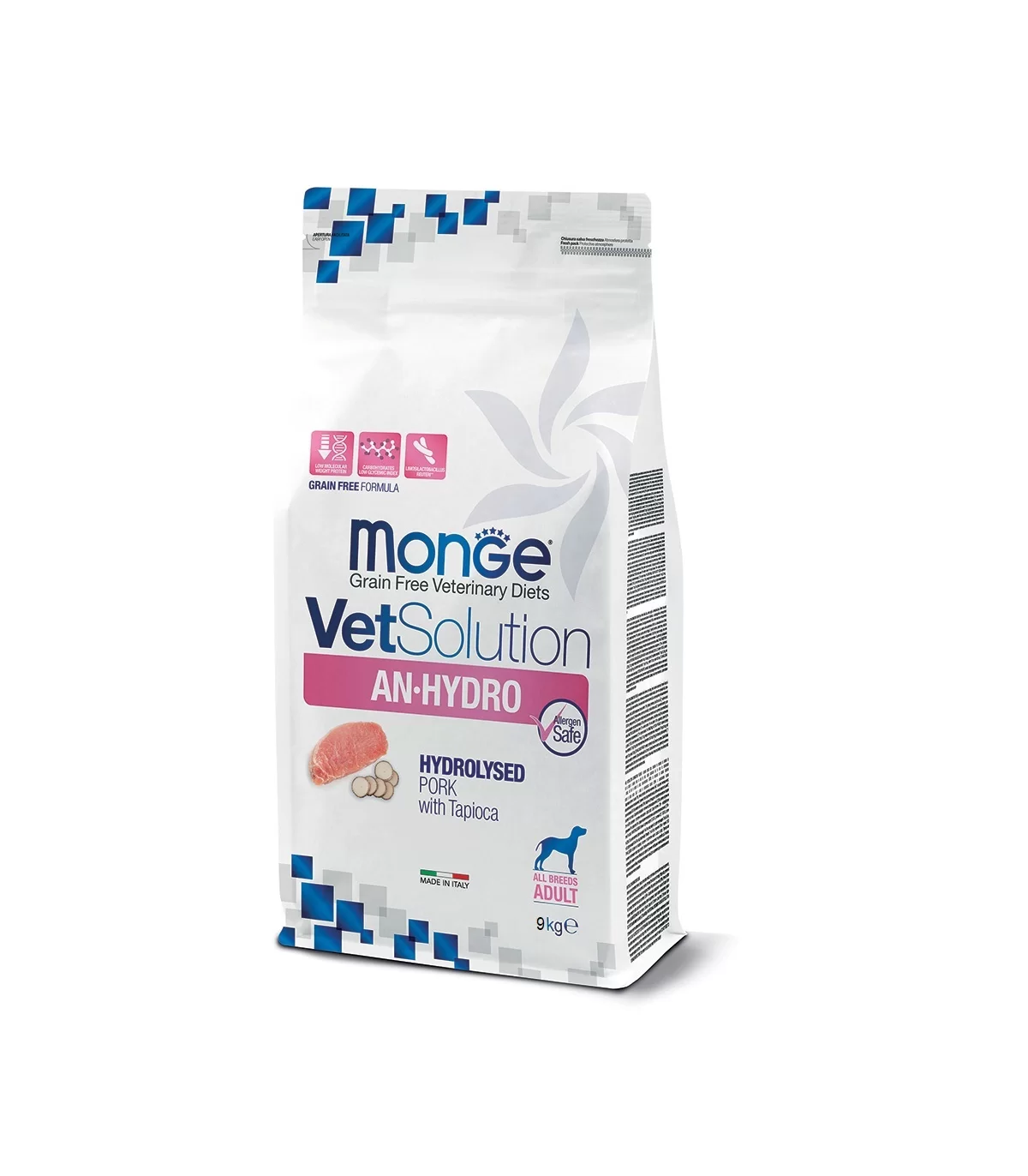 MONGE VETSOLUTION AN·HYDRO CANINE è un alimento dietetico completo altamente digeribile per cani, formulato con un’unica fonte proteica idrolizzata a basso peso molecolare per la riduzione di intolleranze a ingredienti e sostanze nutritive; un’unica fonte di carboidrati selezionati come la tapioca che ne garantisce un basso indice glicemico. La formulazione è caratterizzata dall’inclusione di prebiotici Xilo-oligosaccaridi (XOS) per preservare il microbiota intestinale, **probiotici vivi Limosilactobacillus reuteri DSM 32203 per la stabilizzazione della flora intestinale e postbiotici (Limosilactobacillus reuteri NBF DC PRO inattivato) per l’equilibrio del sistema immunitario. Questi ingredienti, unitamente al profilo aminoacidico equilibrato (aminoacidi essenziali e non), influenzano positivamente il microbiota intestinale, favorendo la proliferazione di lattobacilli, bifidobatteri e l’incremento dell’acido butirrico a livello intestinale.
