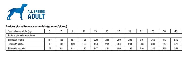 La razione giornaliera raccomandata indicata in tabella può essere suddivisa in 2 pasti giornalieri. Si raccomanda acqua a volontà fresca, pulita e disponibile in ogni momento. Periodo di impiego raccomandato da 3 a 8 settimane. Se i sintomi di intolleranza scompaiono, il mangime può essere impiegato inizialmente fino a un anno. Mangime per animali non idoneo al consumo umano.