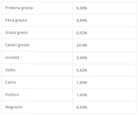 Destrosio 32%, farina (di semi) di soia, ossido di magnesio 11,6%, semi di fieno greco in polvere 5,6%, fosfato dicalcico, prodotti ottenuti dalla trasformazione di erbe (cimicifuga – Cimicifuga racemosa (L.) Nutt.- radice polvere) 4,1%, carote essiccate in polvere, cloruro di sodio, carbonato di magnesio, cloruro di magnesio, malto estratto da orzo, maltodestrina.