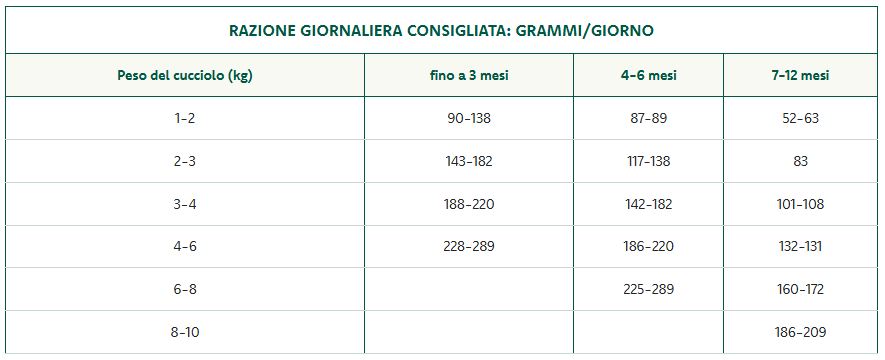 La razione giornaliera indicata può variare in base al livello di attività fisica dell'animale.