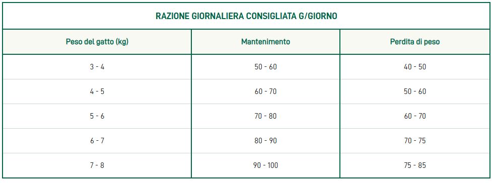 Il passaggio da un altro alimento ad Oasy deve essere effettuato gradualmente in 7 giorni. La razione giornaliera indicata può variare in base al livello di attività fisica dell'animale.