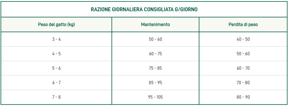 Il passaggio da un altro alimento ad Oasy deve essere effettuato gradualmente in 7 giorni. La razione giornaliera indicata può variare in base al livello di attività fisica dell'animale.