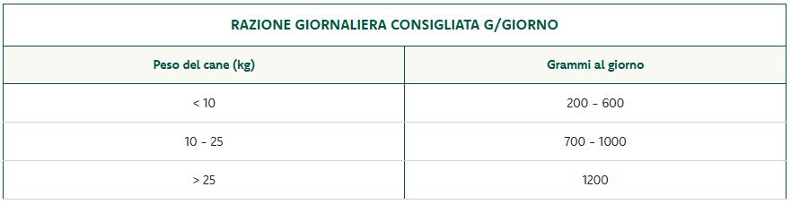 Oasy è pronto per l’uso e va servito a temperatura ambiente. La razione giornaliera indicata può variare in base al livello di attività fisica dell'animale. Si consiglia di suddividere la razione in due pasti giornalieri. Lascia sempre a disposizione del tuo cane acqua fresca e pulita.