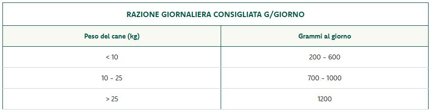 Oasy è pronto per l’uso e va servito a temperatura ambiente. La razione giornaliera indicata può variare in base al livello di attività fisica dell'animale. Si consiglia di suddividere la razione in due pasti giornalieri. Lascia sempre a disposizione del tuo cane acqua fresca e pulita.