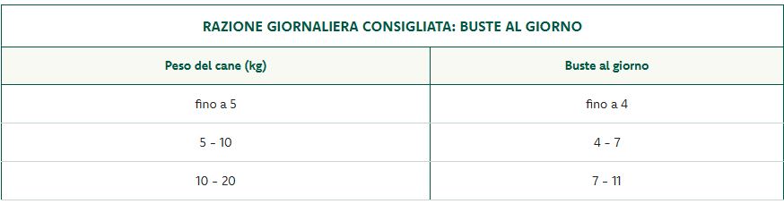 La razione giornaliera indicata può variare in base al livello di attività fisica dell'animale. Si consiglia di suddividere la razione in più pasti giornalieri. Servire a temperatura ambiente. Conservare in luogo fresco e asciutto. Dopo l’apertura richiudere, conservare in frigorifero e consumare entro 2 giorni.