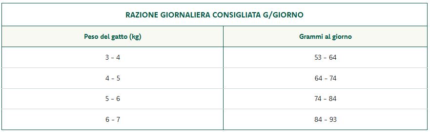 Il passaggio da un altro alimento ad Oasy deve essere effettuato gradualmente in 7 giorni. La razione giornaliera indicata può variare in base al livello di attività fisica dell'animale.