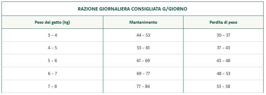 Il passaggio da un altro alimento ad Oasy deve essere effettuato gradualmente in 7 giorni. La razione giornaliera indicata può variare in base al livello di attività fisica dell'animale.