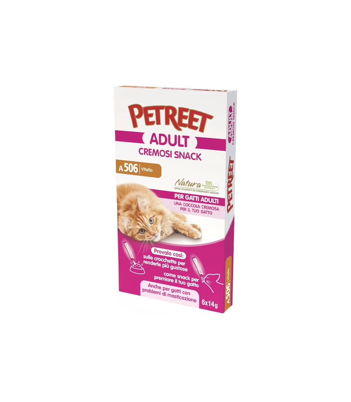 INFORMAZIONI: I Cremosi Snack sono l'ideale per spuntini fuori pasto o per rendere più appetibile e gustoso l'alimento principale. Questo prodotto è realizzato con pregiata carne di vitello, con materie prime di alta qualità, senza coloranti né conservanti aggiunti. La sua consistenza cremosa, inoltre, lo rende adatto anche ai gatti con problemi di masticazione.