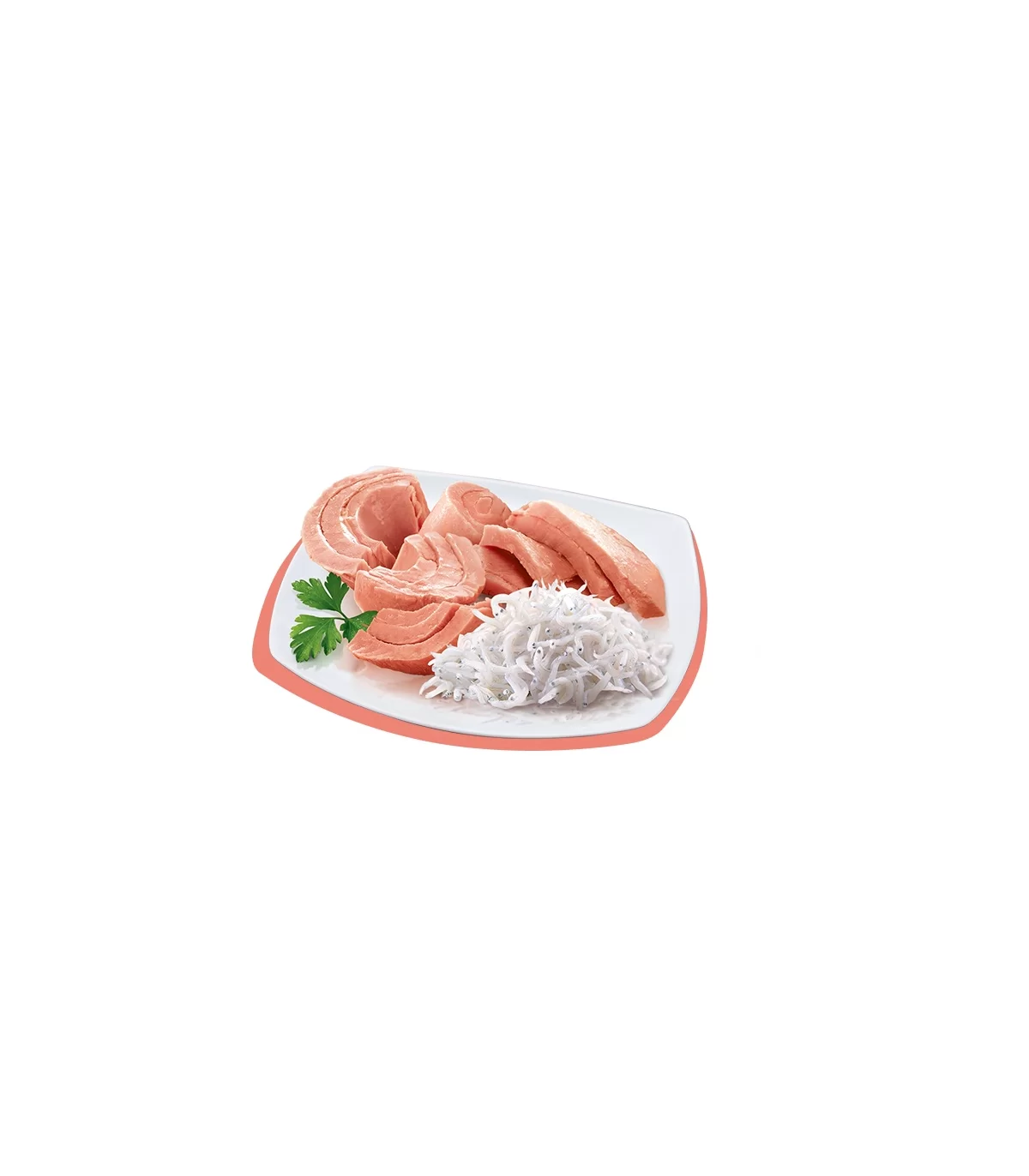 COMPOSIZIONE: Filetto di tonno 50%, pesce dell’oceano 4%, estratto di proteine di pesce, amido di tapioca, riso 1%, prodotti del lievito, sostanze minerali.