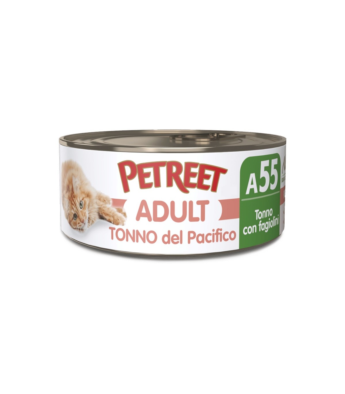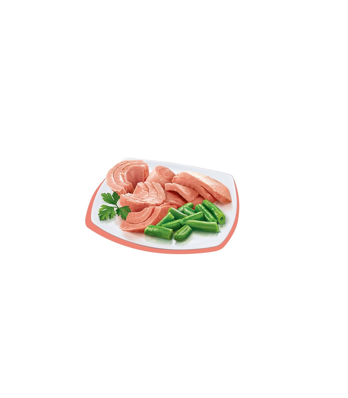 COMPOSIZIONE: Filetto di tonno 50%, fagiolini 4%, estratto di proteine di pesce, amido di tapioca, riso 1%, prodotti del lievito, sostanze minerali.