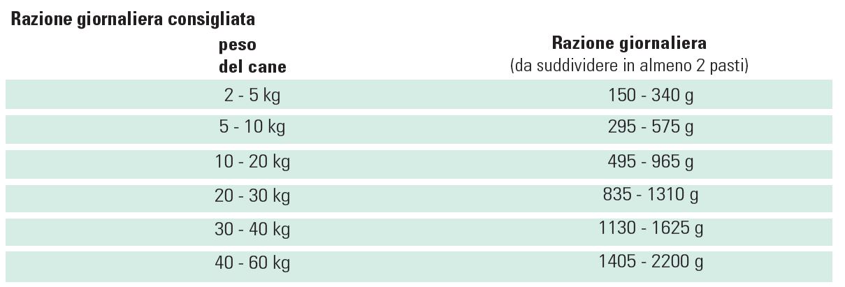 Modalità d’uso: Vedi tabelle nelle immagini. Da 3 a 8 settimane, se i sintomi di intolleranza scompaiono, il prodotto può essere usato inizialmente fino a 1 anno. Si raccomanda di chiedere il parere di un Medico Veterinario prima dell’uso oppure prima di estendere il periodo di impiego. Lasciare sempre a disposizione acqua fresca e pulita. Le quantità riportate in tabella rappresentano delle indicazioni e possono essere adattate a seconda del cane e della sua patologia.