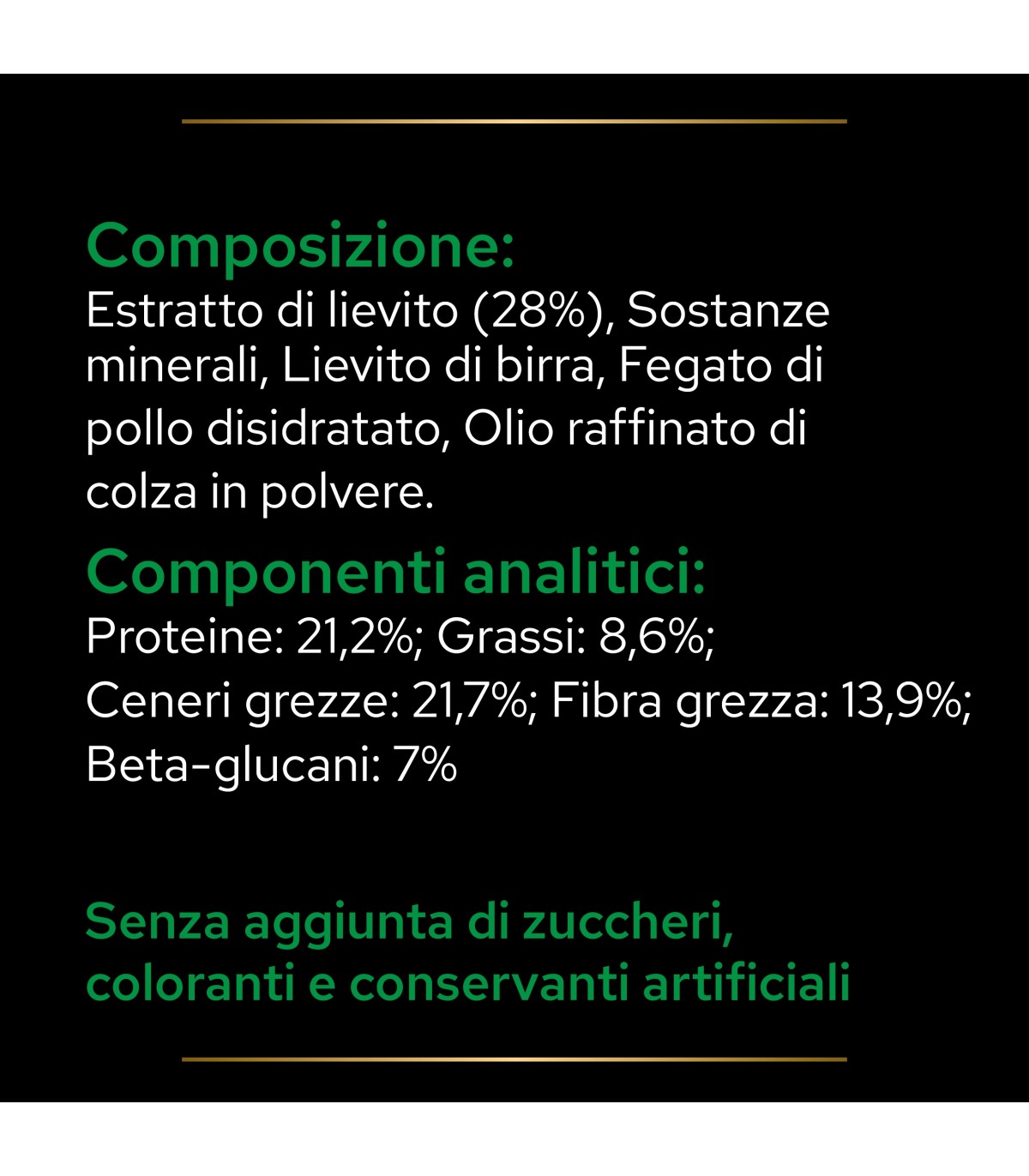 Composizione: Estratto di lievito (28%), Sostanze minerali, Lievito di birra, Fegato di pollo disidratato, Olio raffinato di colza in polvere.