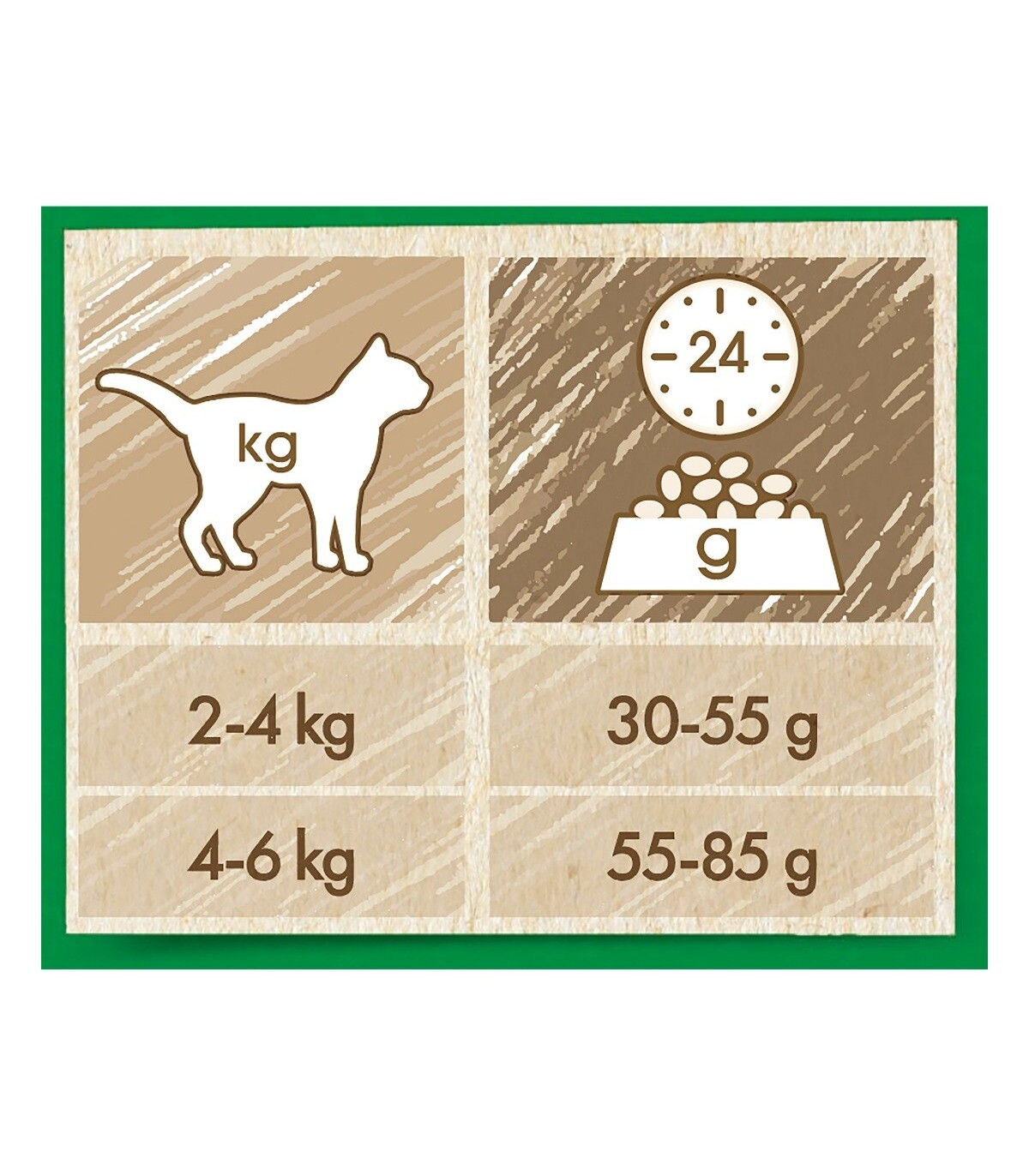 Modalità d'uso: le razioni giornaliere raccomandate devono essere modificate in base alle condizioni climatiche, al livello di attività del gatto e alle sue condizioni fisiche. Lasciare sempre a disposizione acqua pulita e fresca.