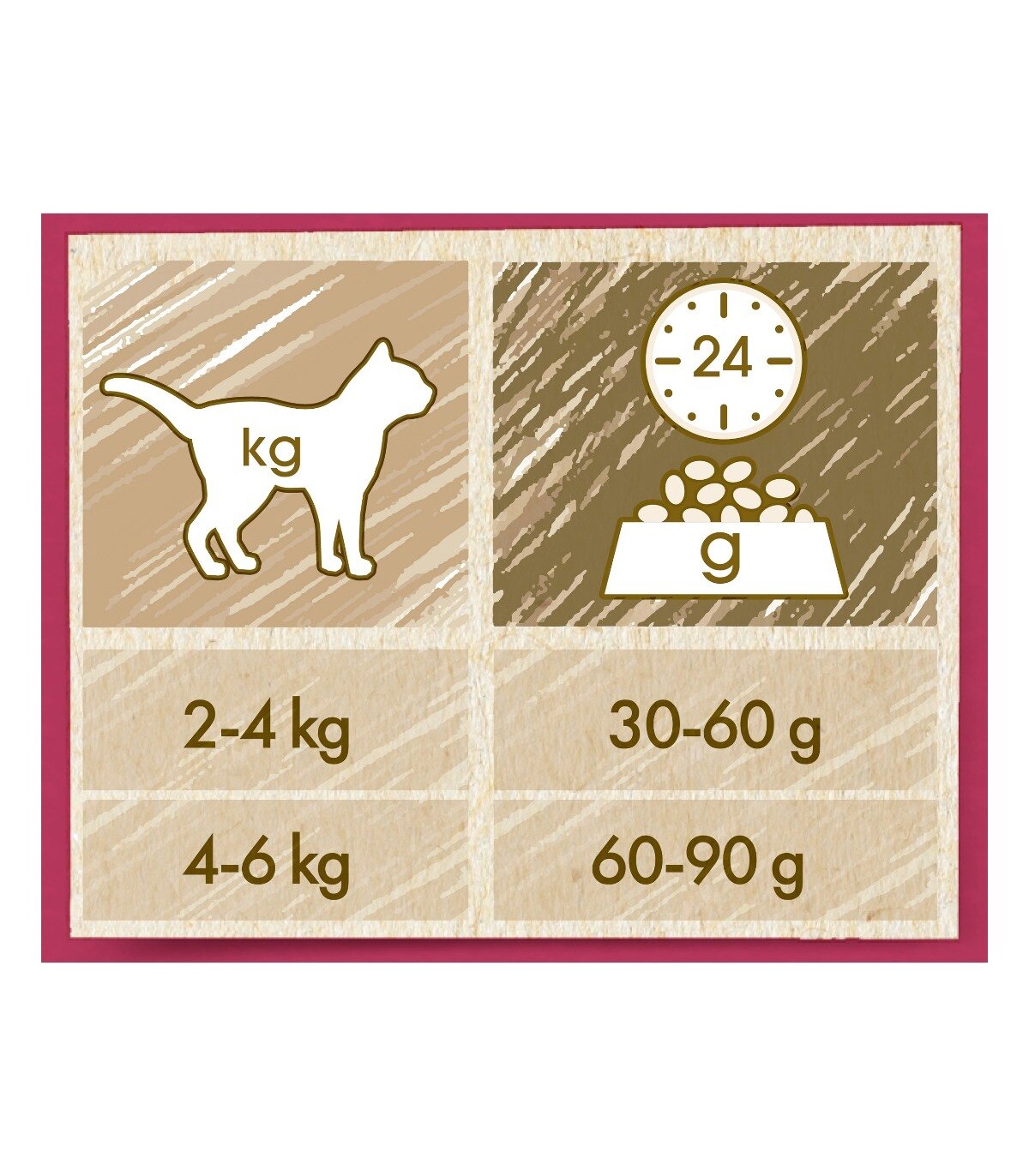 Modalità d'uso: le razioni giornaliere raccomandate devono essere modificate in base alle condizioni climatiche, al livello di attività del gatto e alle sue condizioni fisiche. Lasciare sempre a disposizione acqua pulita e fresca.