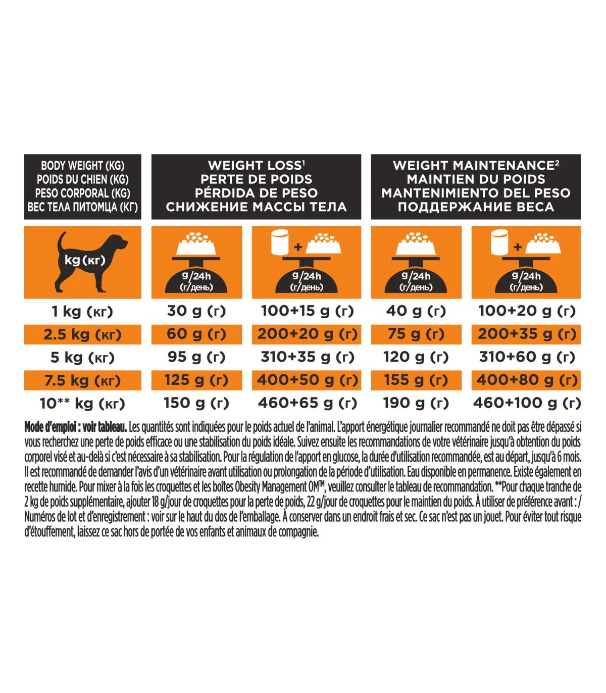 Modalità d’uso e razione giornaliera raccomandata: vedere tabella. Le quantità indicate si riferiscono al peso corporeo attuale. Ai fini di un’efficiente perdita di peso o del mantenimento del peso ideale, non dovrebbe essere superato l’apporto energetico giornaliero raccomandato. Seguire le raccomandazioni del veterinario fino al raggiungimento del peso corporeo ideale e in seguito, se necessario, per mantenerlo. Per il controllo dell’apporto di glucosio, il periodo d’uso raccomandato è inizialmente fino a 6 mesi. Si raccomanda di chiedere il parere di un veterinario prima dell’uso oppure prima di estendere il periodo di impiego. Lasciare sempre a disposizione acqua fresca e pulita. Per ogni 2 kg di peso corporeo aggiuntivi, somministrare altri 18 g di alimento secco al giorno per la perdita di peso e somministrare altri 22 g di alimento secco al giorno per il mantenimento del peso.