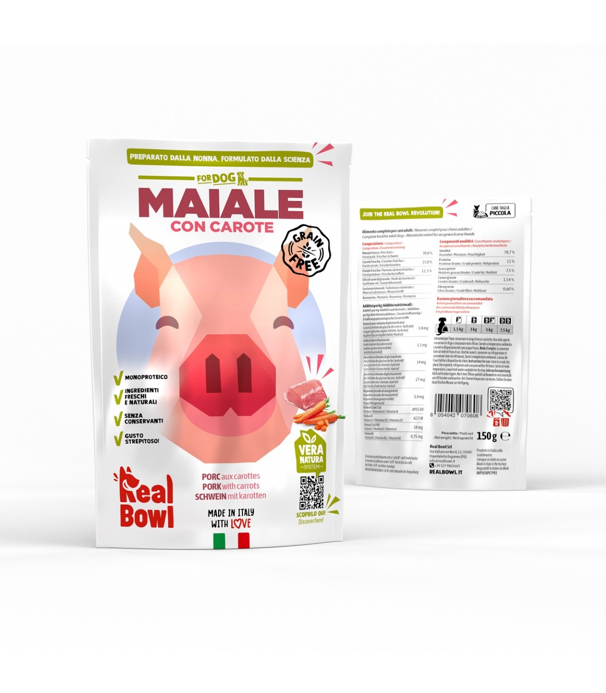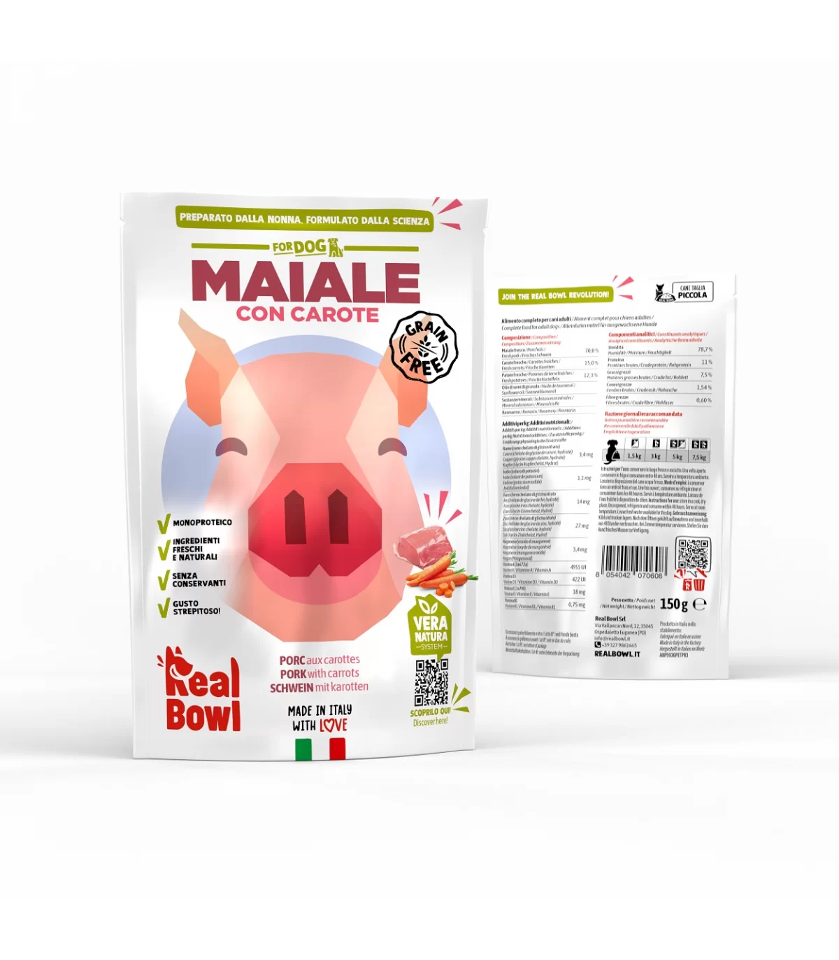 Real Bowl Maiale Grain free è un alimento completo per cani di tutte le taglie con unica fonte proteica di origine animale.