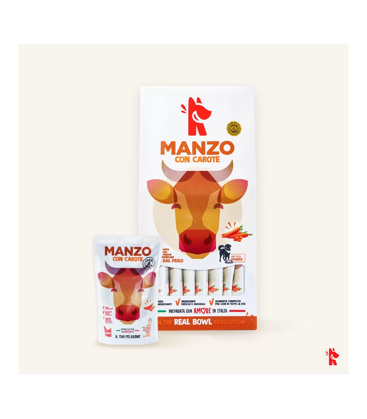 Real Bowl Manzo Grain free è un alimento completo per cani di tutte le taglie con unica fonte proteica di origine animale.