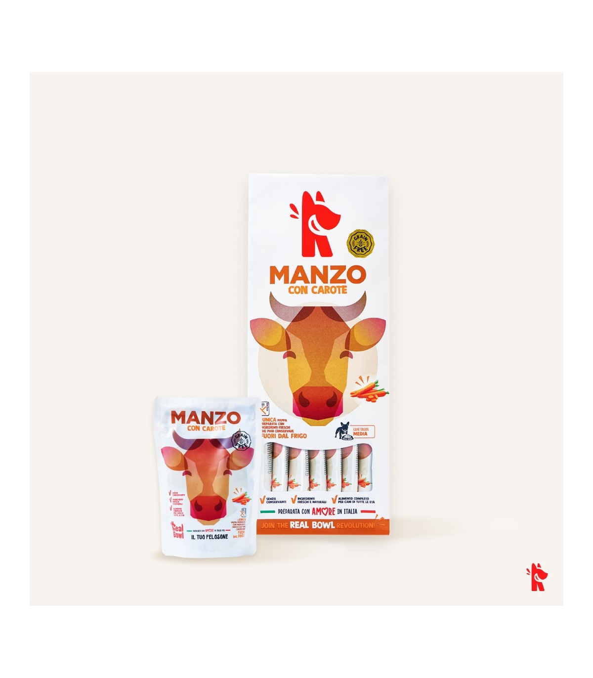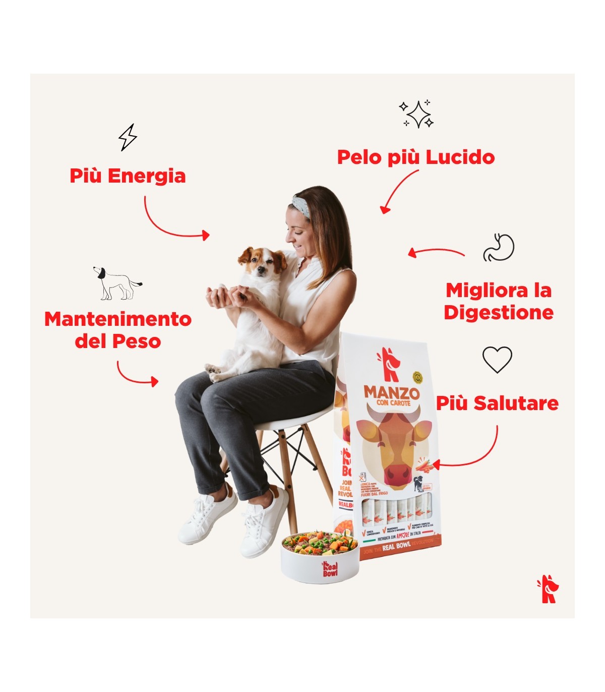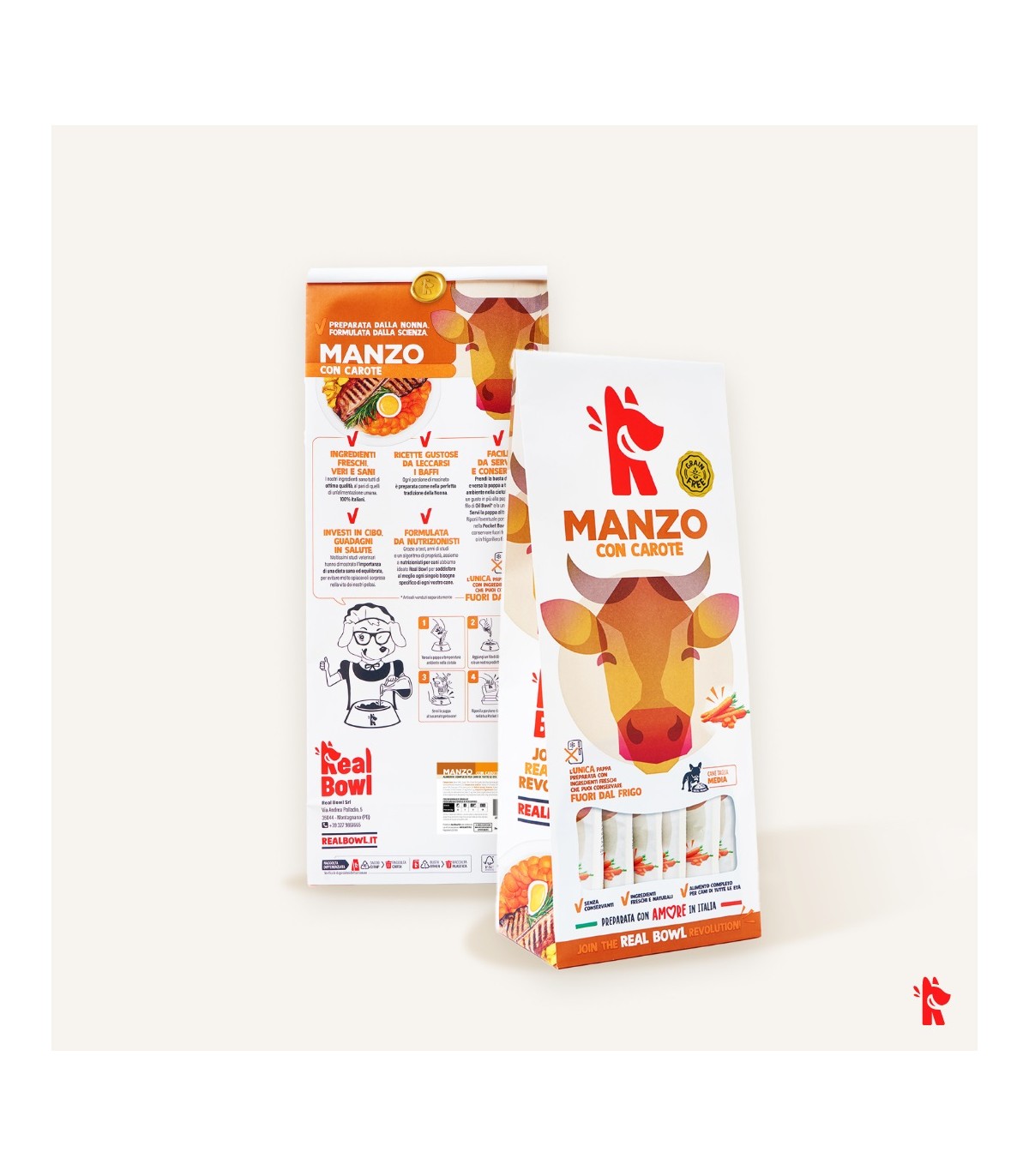 Le ricette Real Bowl contengono alimenti freschi in origine destinati al consumo umano. Il prodotto è da considerarsi come un pasto sostituivo per la dieta casalinga e vanta la comodità di poterlo utilizzare velocemente e conservarlo a temperatura ambiente.