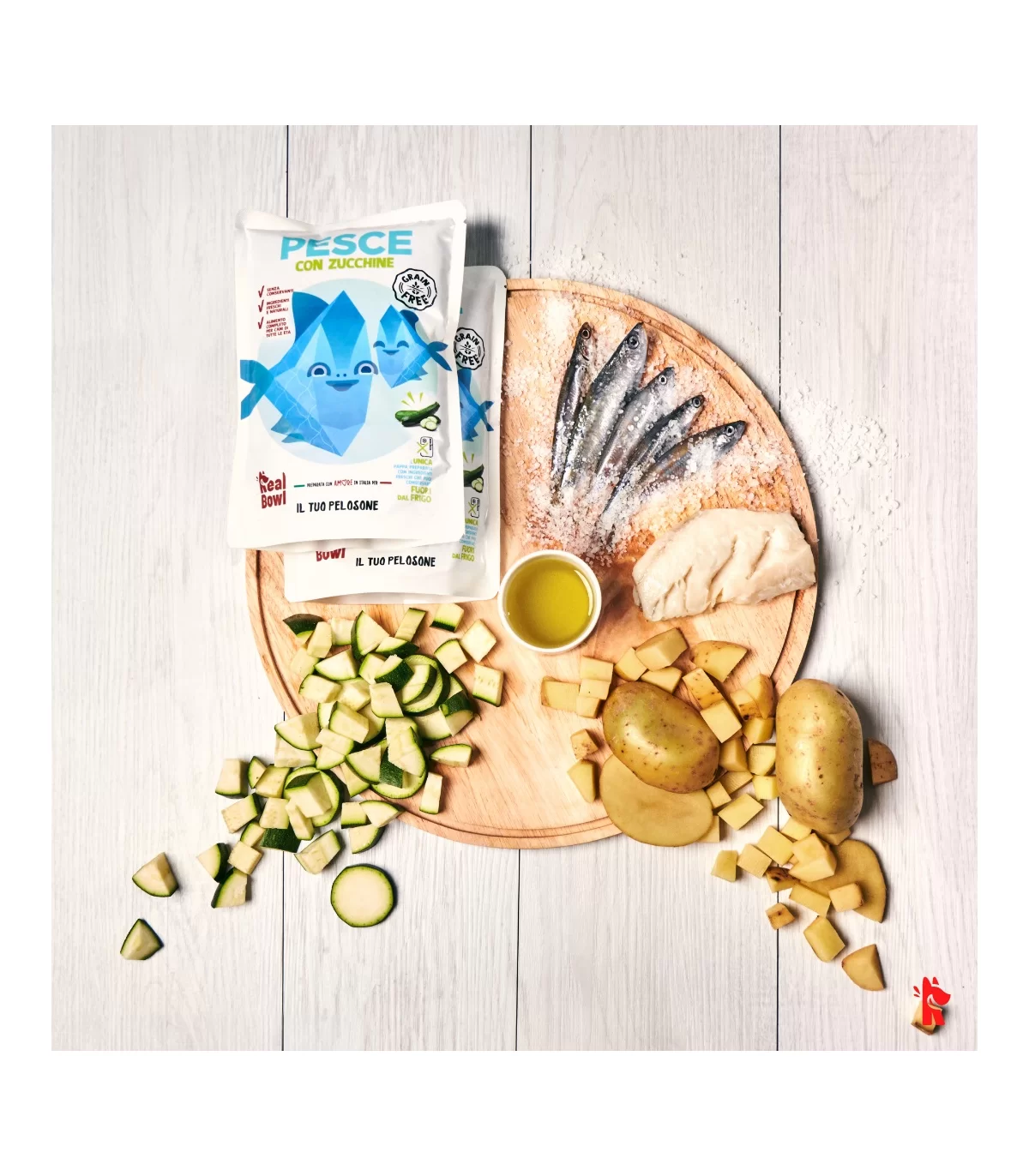 Pesce (60%) (merluzzo 33%, sardine 27%), patate (22%), zucchine (6%), olio di semi di girasole (2,8%), olio di semi di lino, sostanze minerali.