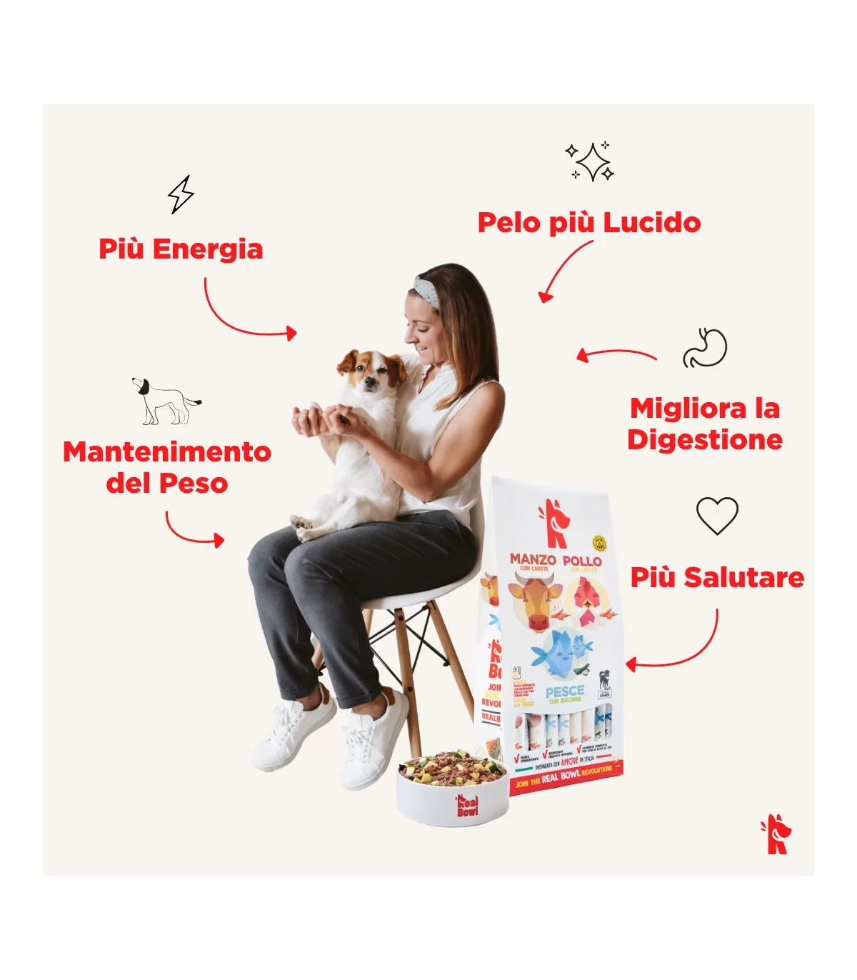 Real Bowl MIX Pesce - Manzo - Pollo Grain free è un alimento completo per cani di tutte le taglie con unica fonte proteica di origine animale.