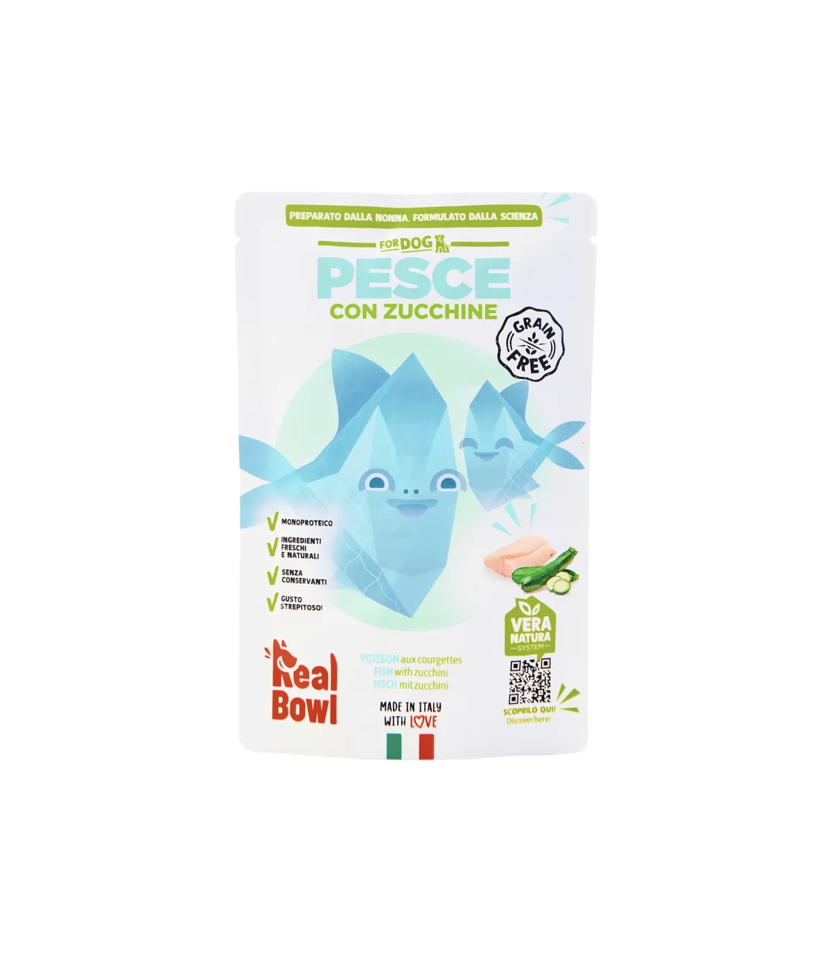 Real Bowl Pesce Grain free è un alimento completo per cani di tutte le taglie con unica fonte proteica di origine animale.