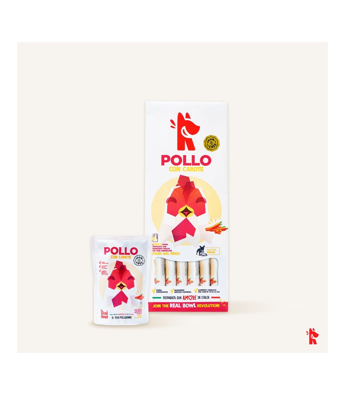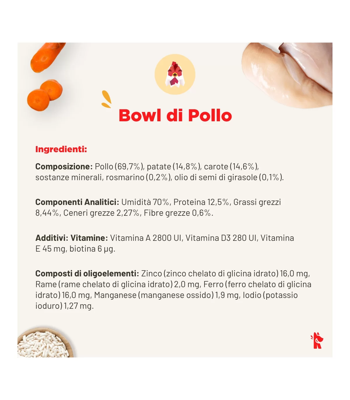 Real Bowl Pollo Grain free è un alimento completo per cani di tutte le taglie con unica fonte proteica di origine animale.