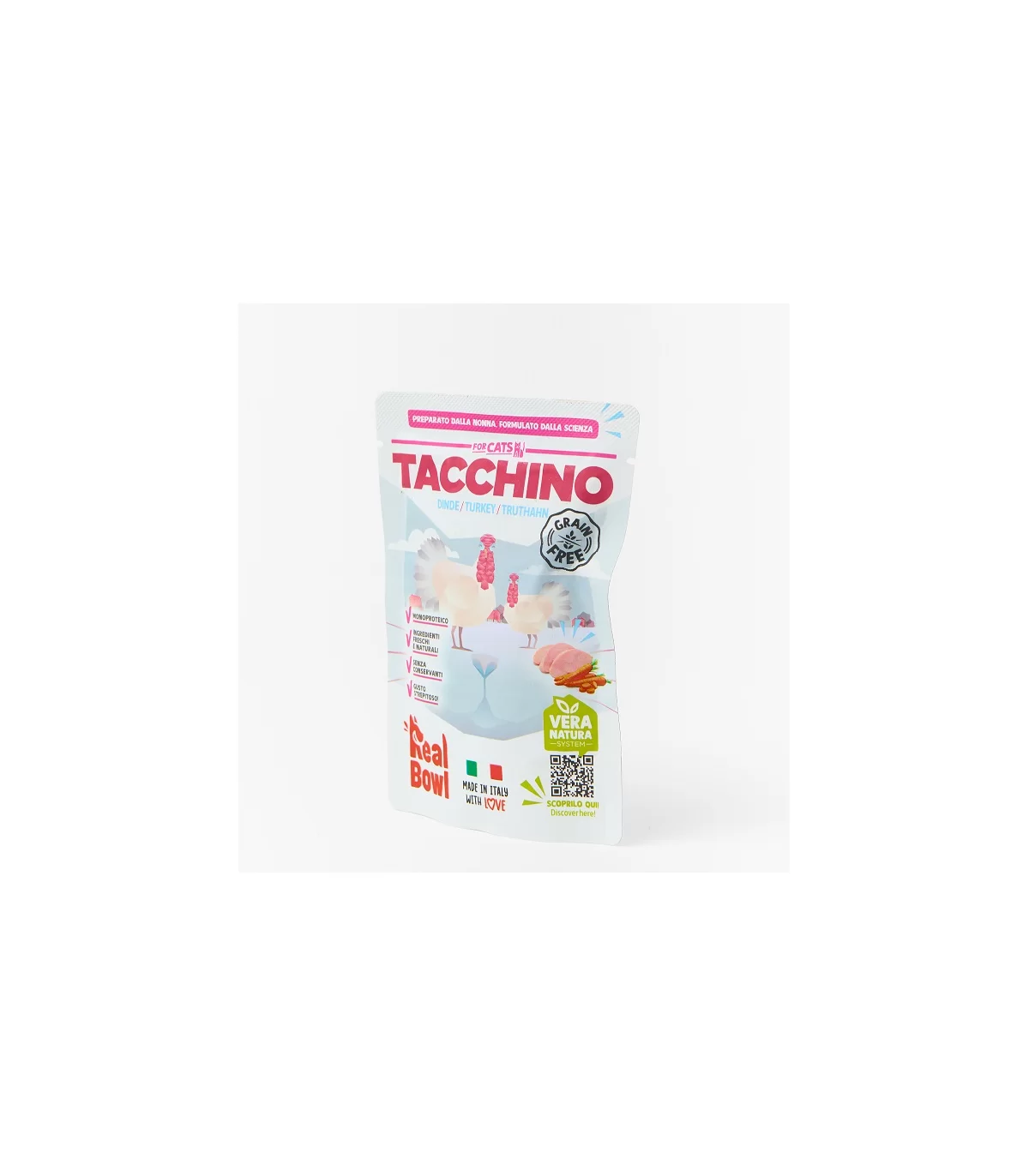 Real Bowl Tacchino Grain free è un alimento completo per gatti con unica fonte proteica di origine animale.