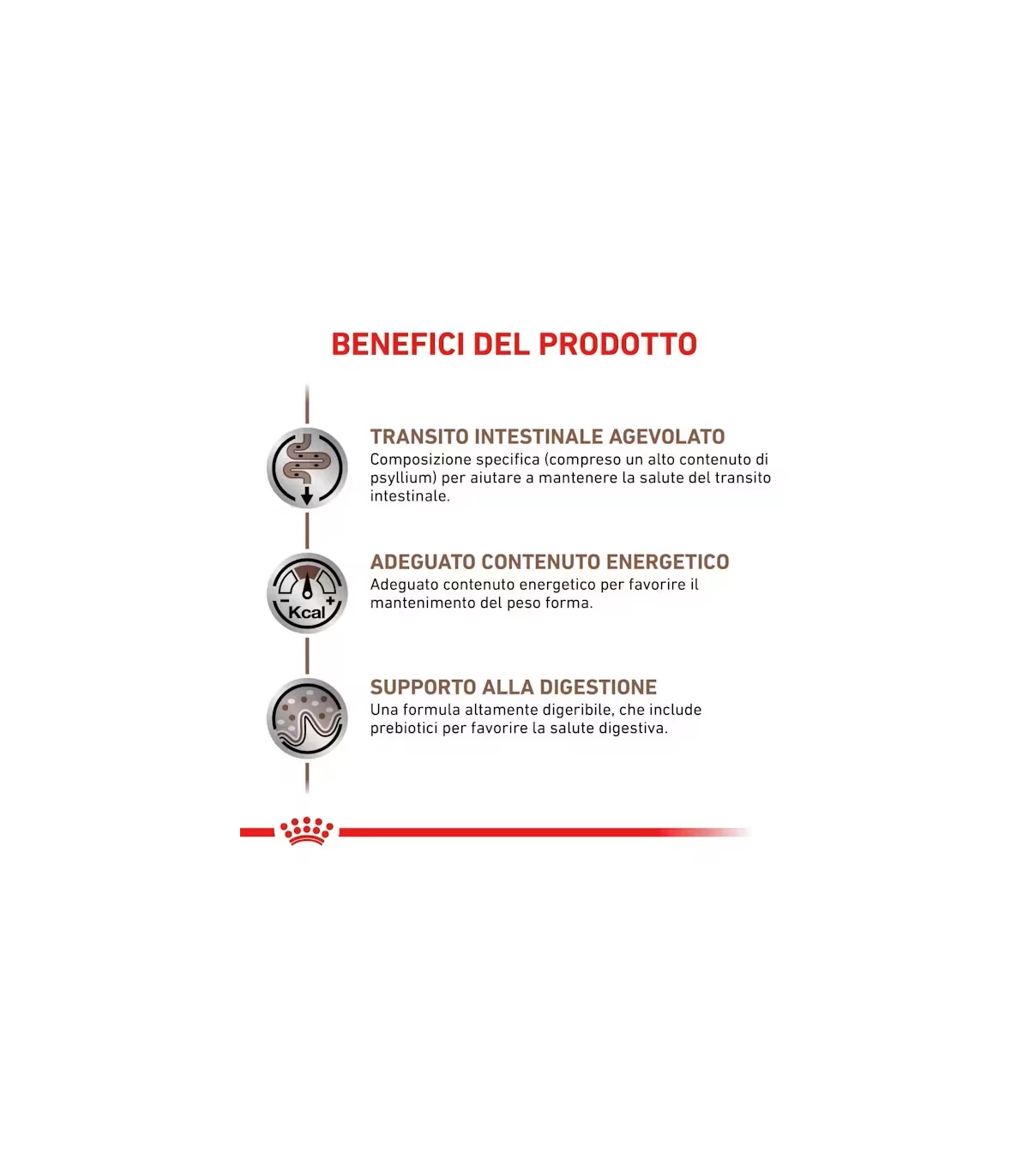 Composizione specifica (compreso un alto contenuto di psyllium) per aiutare a mantenere la salute del transito intestinale. Questo alimento è formulato per favorire la salute dell’ambiente urinario. Come parte della gamma GastrointestinalROYAL CANIN®, è importante che questo prodotto venga somministrato al tuo animale domestico solo su consiglio di un medico veterinario. La transizione del tuo animale domestico da una dieta all'altra dovrebbe essere un processo lento e graduale nell'arco di un periodo di 7-10 giorni. Assicurati di seguire la corretta quantità di razionamento, specialmente durante l'alimentazione mista.