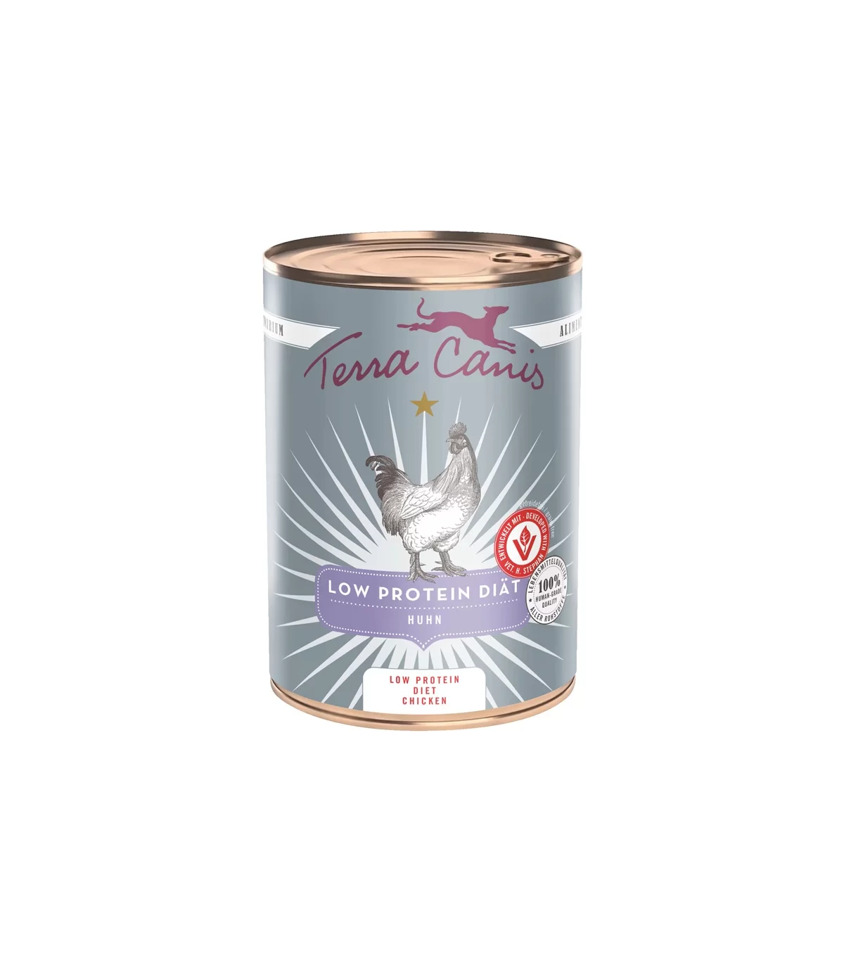 Caratterizzati da un valore biologico particolarmente elevato e da componenti nutrizionali equilibrate, i menù della linea LOW PROTEIN presentano un contenuto limitato di proteine, un quantitativo moderato di grassi e al contempo una maggiore percentuale di fibre. Anche il quantitativo di rame, fosforo e sodio è ridotto. Questi menù assicurano al cane un apporto calorico sufficiente grazie a fonti energetiche non proteiche costituite da olio di colza, patate e farina di cocco che è un superfood. Di conseguenza sono state evitate frutta e verdura contenenti rame, mentre sono state integrate erbe salutari come la betulla, l'ortica e il tarassaco. Queste erbe sono note per il loro effetto positivo su fegato e reni. Inoltre è stata aggiunta la zucca, che si dice favorisca la funzionalità renale. I cereali sono stati evitati perché la digestione complessa ed energeticamente dispendiosa delle loro componenti, difficilmente utilizzabili dal cane, può causare la formazione di prodotti di scarto che sovraccaricano reni e fegato.
