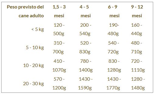 Queste cifre sono indicative. Si raccomanda una tabella di crescita veterinaria.