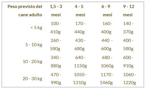 Queste cifre sono indicative. Si raccomanda una tabella di crescita veterinaria.