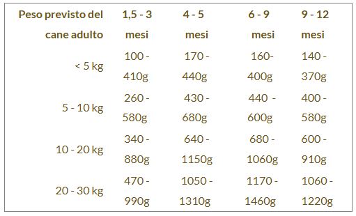 Queste cifre sono indicative. Si raccomanda una tabella di crescita veterinaria.