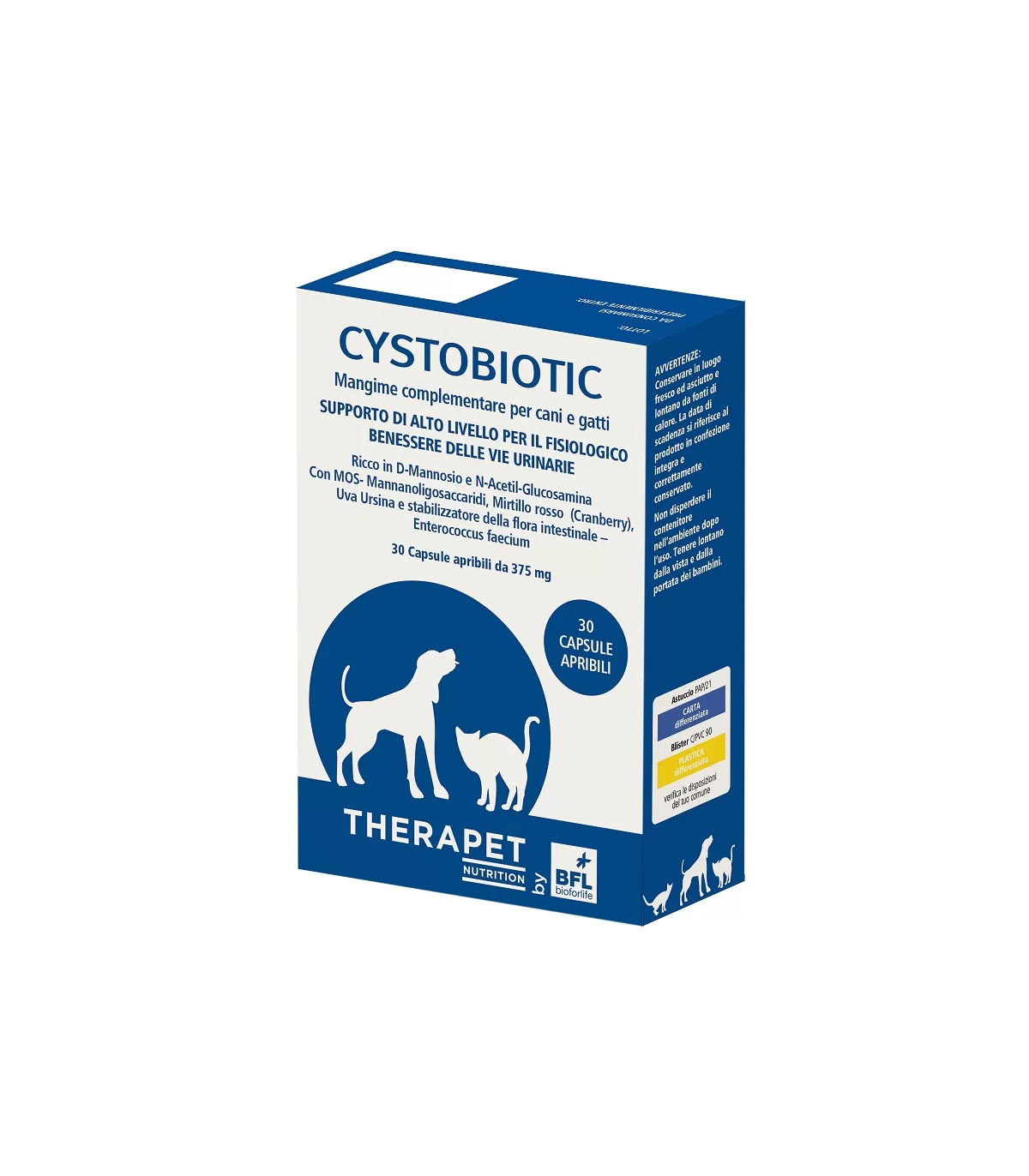 CYSTOBIOTIC è un mangime complementare in capsule apribili per cani e gatti formulato ad alto contenuto di D-Mannosio e N-Acetil-Glucosamina, con MOS-Mannanoligosaccaridi, Mirtillo rosso (Cranberry), Uva Ursina